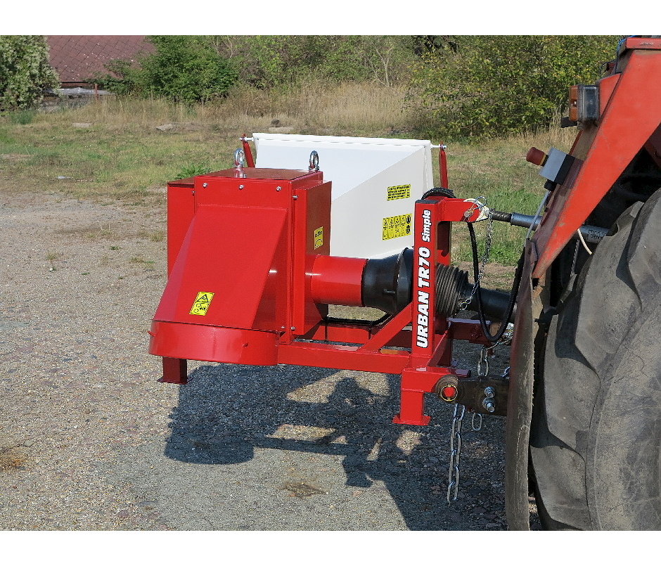 Štěpkovač (špalíkovač) URBAN TR70 Simple je nesený na tříbodovém závěsu traktoru. Optimální výkon traktoru je 50 hp a více, minimální výkon je 30 hp. Pohon musí být zajištěn přes kardan s přetěžovací spojkou (není součástí stroje - najdete ho v sekci příslušenství). Pro snížení rázů přenášených na kardan a do převodovky traktoru je možné ke štěpkovači objednat setrvačník.